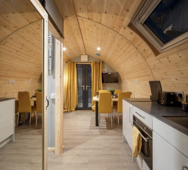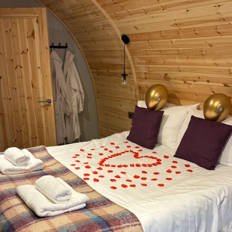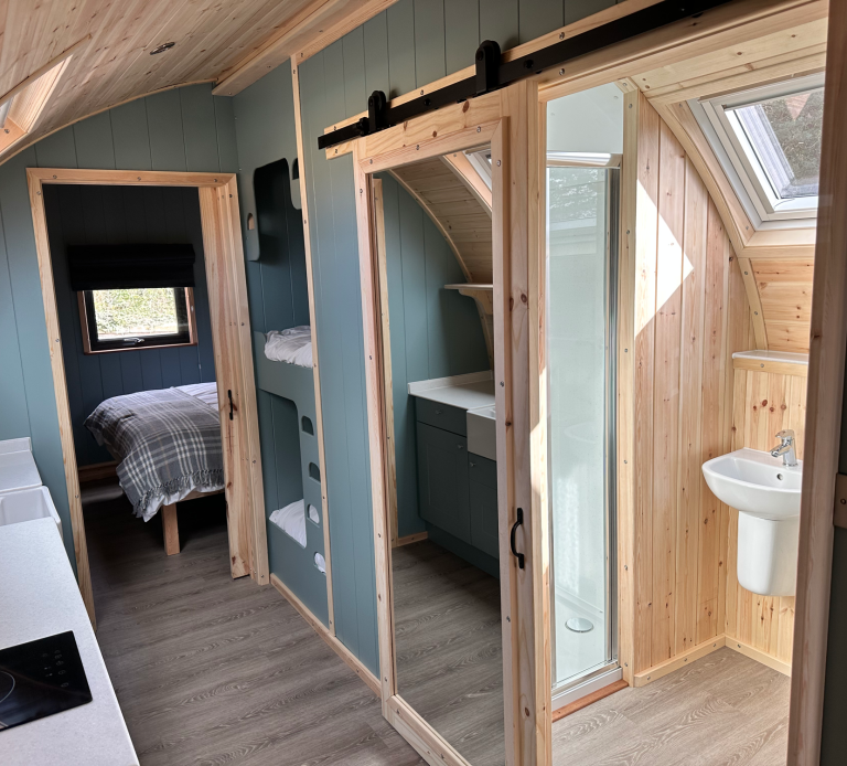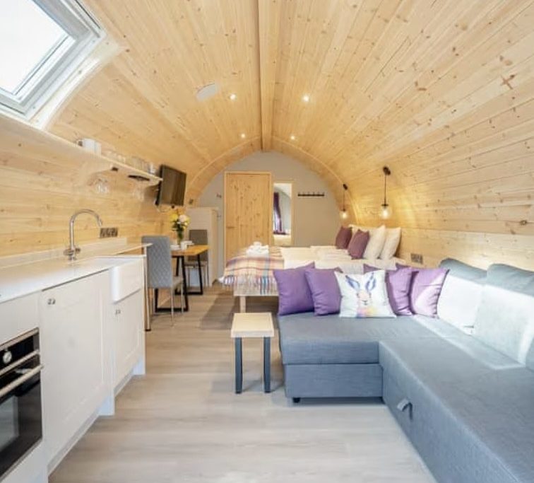 This cosy and well-designed pod is perfect for a romantic retreat and is accessible for all. The open-plan layout makes the most of the space, featuring a comfortable king-size bed, a sofa bed, a wet room, and a kitchenette. Like our other pods, Hare Lodge has its own private veranda with seating and a sheltered hot tub.