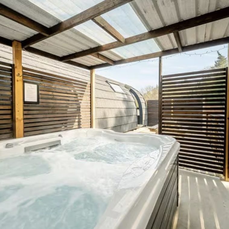 This quirky mega pod provides everything you need for a relaxing break. It features a king-size bedroom equipped with a 32" Smart TV and plenty of storage. An additional sleeping area is located in the living space, which includes a double sofa bed, perfect for two children. The sheltered outdoor veranda offers a seamless indoor-outdoor living experience, alongside an enclosed garden and your very own private hot tub. The hot tub is positioned under a pergola, allowing it to be enjoyed whatever the weather.